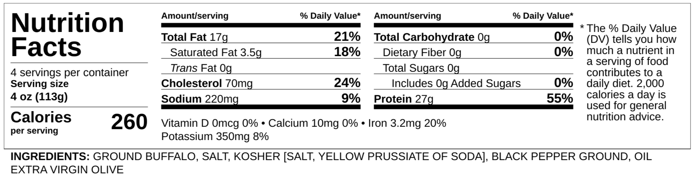 Bison, Kosher Salt (Salt, Yellow Prussiate Of Soda), Ground Black Pepper, Extra Virgin Olive Oil