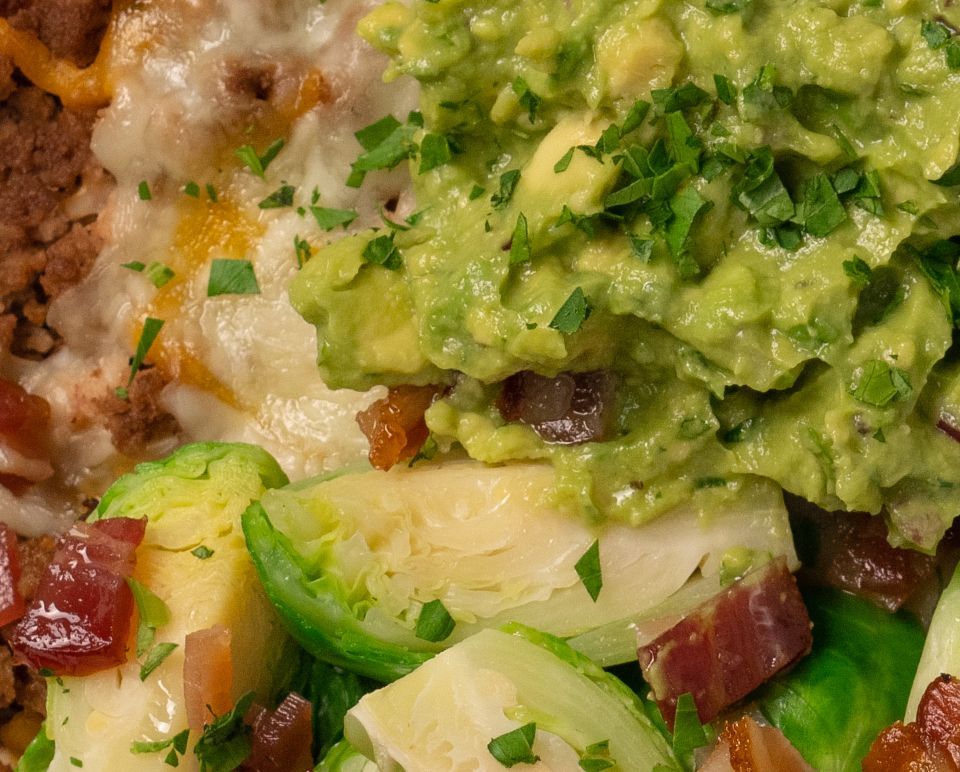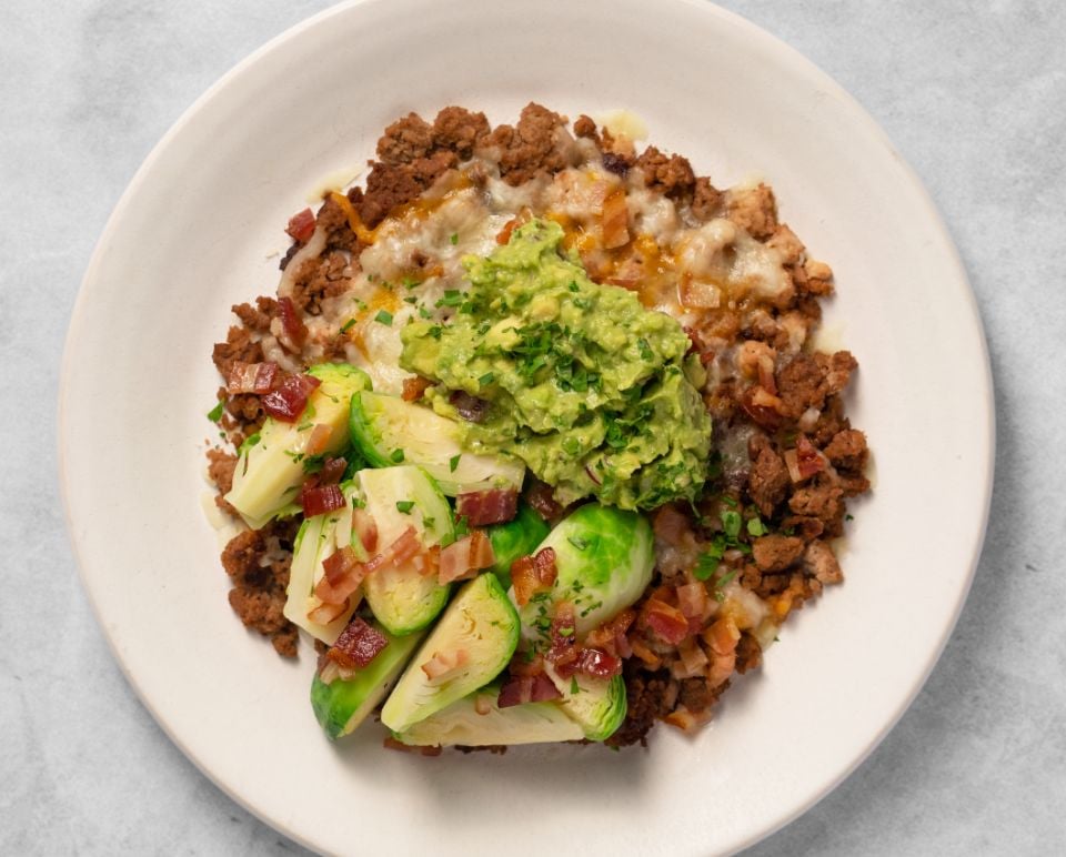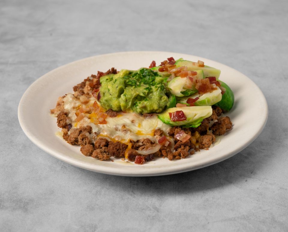 This flavorful bowl starts with lean ground turkey cooked to perfection. It’s then combined with Brussels sprouts and topped with slices of Swiss cheese for a melty, cheesy goodness. We’ve also added medium sliced mushrooms and crispy Applewood smoked bacon for extra flavor. Enjoy with a side of creamy guacamole.